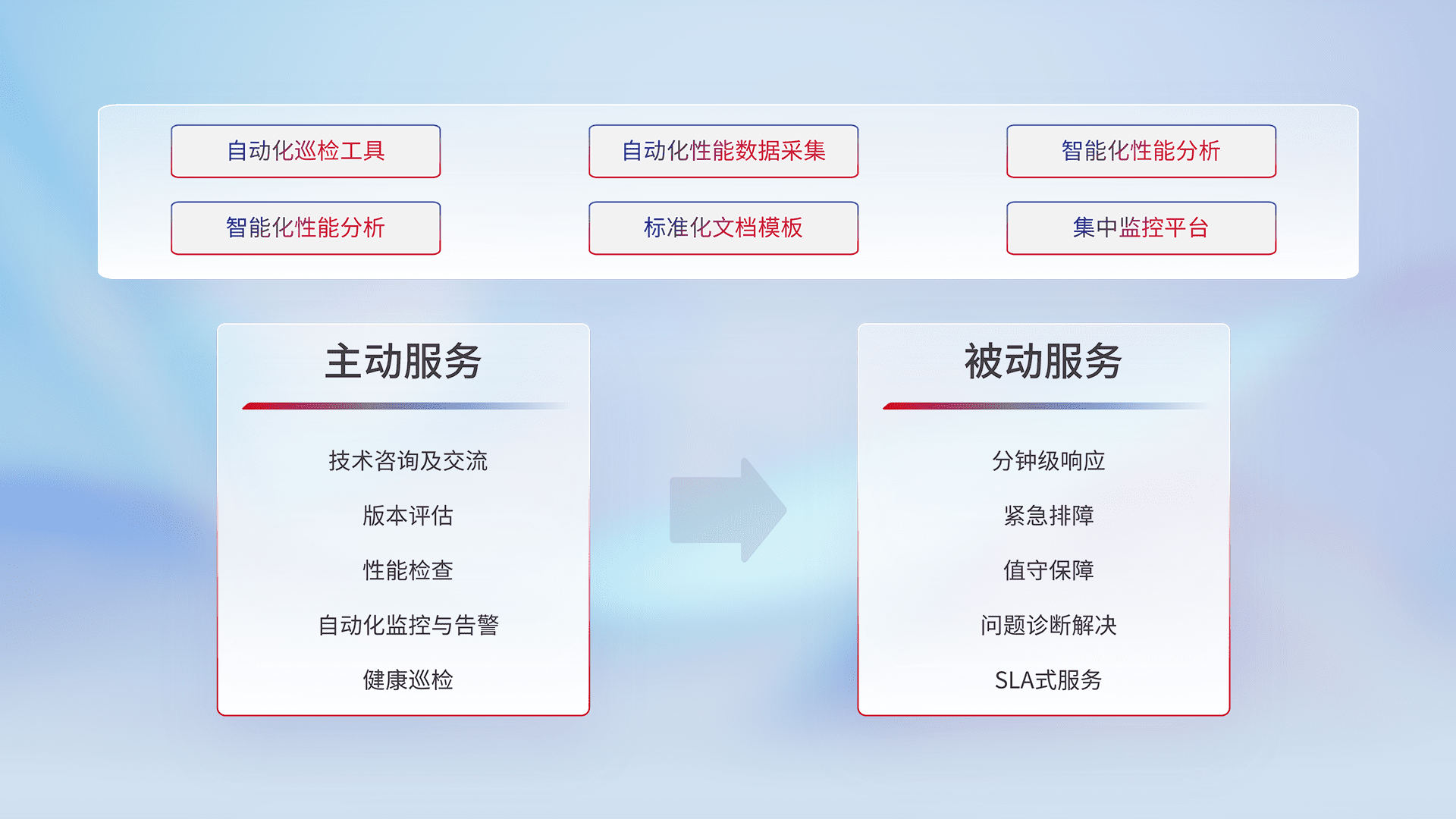 智能化工具和标准化文档,,,,保障服务质量,,,,提供主动服务(包含技术咨询、、、、版本评估、、、性能检查、、、自动化监控与告警、、健康巡检)和被动服务包含(分钟级响应、、、紧急排障、、、、值守保障、、、问题诊断解决、、、、SLA服务)。。。。